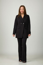 Брючный комплект из костюмной ткани на подкладке. Двубортный жакет полуприталенного силуэта с отрезными бочками и вытачками по переду и спинке. Воротник-с отложными лацканами пиджачного типа. По переду - прорезные  карманы  с клапанами. Рукава длинные, двухшовные. Жакет застегивается на две пуговицы. Брюки-клеш, плотно сидящие по фигуре, с  началом расширения 5см выше колена. Брюки с карманами по переду и обтачкой-поясом. Застегиваются по переду на молнию и пуговицу.