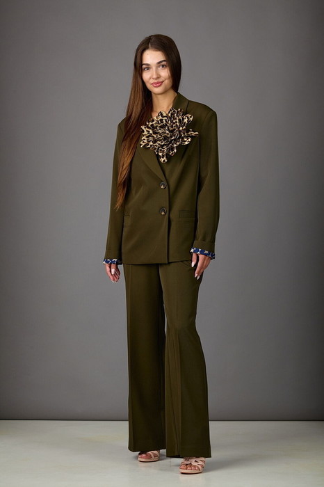 Двубортный жакет прямого силуэта с вытачками по переду. Карманы с листочками. Воротник - пиджачного типа. В среднем шве спинки - планка, застегивающаяся на пуговицы. Рукава - втачные, двухшовные. Застежка на 2 пуговицы и одну потайную. Цветок-брошь входит в комплект. Широкие брюки с поясом и карманами. По бокам пояса-резинка.Застегиваются по переду на молнию и пуговицу.