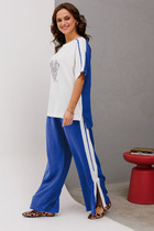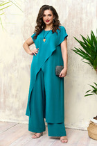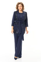Комплект женский, состоящий из жакета и брюк, выполнен  из стрейчевой  костюмной ткани на подкладке. Жакет полуприталенного  силуэта с рельефами по переду и спинке, отрезной по линии талии, с баской. Карманы-эмитация. Воротник - пиджачного типа. Рукава - втачные, двухшовные.  Застежка на 2 пуговицы. Брошь ручной работы съемная. Брюки слегка заужены к низу, с поясом. Посадка-средняя. Застегиваются на молнию по переду и одну пуговицу.