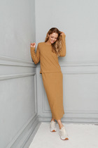 Брючный комплект из костюмной ткани на подкладке.  Жакет с расширенной линией плеч, с отрезными бочками по переду и спинке и вытачками по переду. Воротник с отложными лацканами пиджачного типа. По переду - прорезные  карманы  с клапанами. Рукава длинные, двухшовные. Жакет застегивается на три пуговицы. Брюки узкие, с двумя карманами и поясом-обтачкой.  Застегиваются на молнию по переду и  одну пуговицу.
