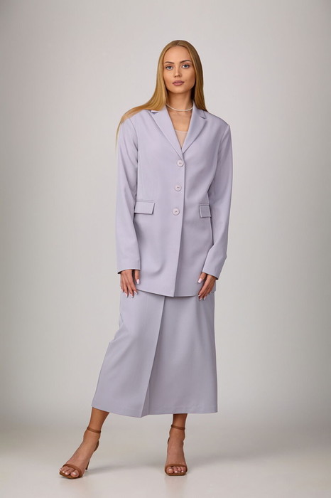 Комплект-двойка, состоящий из пиджака и юбки. Пиджак из костюмной ткани на подкладке с расширенной линией плеч, с отрезными бочками по переду и спинке и вытачками по переду. Воротник-с отложными лацканами пиджачного типа. По переду - прорезные карманы с клапанами. Рукава длинные, двухшовные. Пиджак застегивается на три пуговицы. Юбка - миди с наклонными карманами и складкой по переду, с широким поясом-обтачкой. Застегиваются на молнию спереди и пуговицу.
