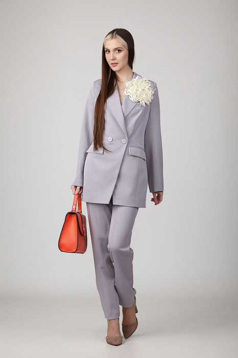Брючный комплект из костюмной ткани на подкладке. Двубортный жакет полуприталенного силуэта с отрезными бочками и вытачками по переду и спинке. Воротник-с отложными лацканами пиджачного типа. По переду - прорезные  карманы  с клапанами. Рукава длинные, двухшовные. Жакет застегивается на две пуговицы. Жакет декорирован цветами-брошами ручной работы. Брюки узкие, с двумя карманами и поясом-обтачкой.  Застегиваются на молнию по переду и  одну пуговицу.