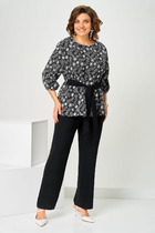 Брючный комплект из костюмной ткани на подкладке. Двубортный жакет полуприталенного силуэта с отрезными бочками и вытачками по переду и спинке. Воротник-с отложными лацканами пиджачного типа. По переду - прорезные  карманы  с клапанами. Рукава длинные, двухшовные. Жакет застегивается на две пуговицы. Жакет декорирован цветами-брошами ручной работы. Брюки прямые со складкой, широким поясом-обтачкой, наклонными карманами. Застегиваются на молнию по переду  и пуговицу.