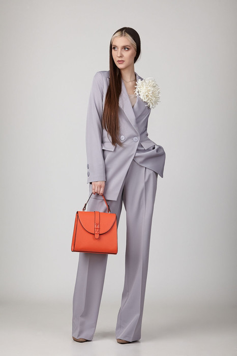 Брючный комплект из костюмной ткани на подкладке. Двубортный жакет полуприталенного силуэта с отрезными бочками и вытачками по переду и спинке. Воротник-с отложными лацканами пиджачного типа. По переду - прорезные карманы с клапанами. Рукава длинные, двухшовные. Жакет застегивается на две пуговицы. Жакет декорирован цветами-брошами ручной работы. Брюки прямые со складкой, широким поясом-обтачкой, наклонными карманами. Застегиваются на молнию по переду и пуговицу.