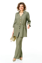 Брючный комплект из костюмной ткани на подкладке.  Жакет прямого силуэта с двумя наклонными вытачками и карманами в боковых швах. Рукава - длинные, двухшовные. Жакет застегивается на 1 пуговицу. Брюки узкие, с двумя карманами и поясом-обтачкой.  Застегиваются на молнию по переду и  одну пуговицу.