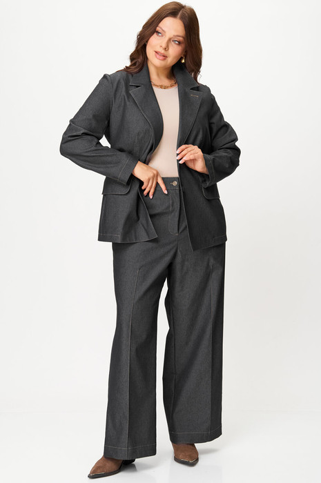 Жакет классической посадки. Ткань джинсовая на стрейчевой основе, что гарантирует комфорт в носке. Жакет частично на поливискозной подкладке. Брюки  средней посадки на талии, пояс частично на резинке, функциональные карманы. По передним половинкам декоративная отстрочка в виде стрелок.