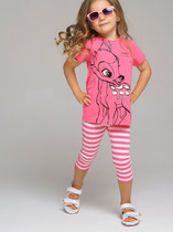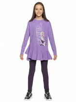 Комплект для девочки из футера, состоящий из 2 изделий: свитшот (джемпер) и леггинсы. Свитшот укороченный прямого силуэта, с длинными рукавами-реглан на манжетах, с капюшоном. По переднему краю капюшона вставлен шнур. На переде принт. Низ свитшота не обр