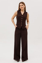Костюм женский из трикотажного гладкокрашенного полотна «кулирка с лайкрой», состоящий из футболки и бридж. Футболка свободного покроя, со спущенным плечом и втачными рукавами длиной до локтя, горловиной овальной формы, обработанной втачной планкой и принтом на полочке, выполненным в технике «шелкографии». В нижней части боковых швов – разрезы.Бриджи – классического покроя, на резинке.