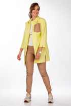 Костюм брючный женский. Блуза А-образного силуэта с удлинением на спинку. По низу блузы волан. Шов притачивания волана декорирован кружевом. Рукав короткий втачной. Длина блузы по спинке 74 см (перед короче на 7 см). Длина рукава 30 см. Длина брюк 104 см.