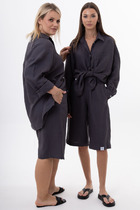 Кардиган прямого силуэта с втачным рукавом. По горловине капюшон со шнурком. Рукава кардигана фиксируются на верх патой. Сборка по рукаву зафиксирована. В боковых швах обработаны карманы и разрезы.