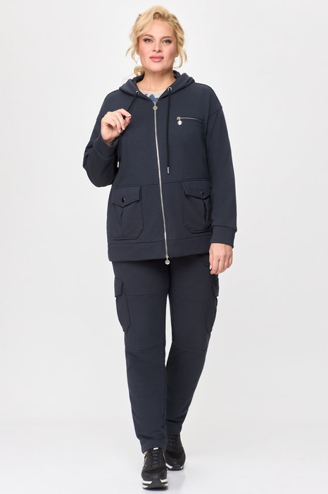Жакет прямого силуэта со спущенной линией плеча на молнии, с капюшоном. По деталях переда в нижней части накладные карманы со встречной складкой и клапаном. В верхней части слева декоративный карман на молнии.
