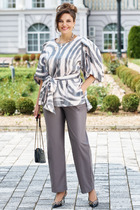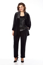 Комплект 3-х предметный, состоящий из жакета, брюк и топа. Жакет и брюки выполнены из качественной костюмной ткани. Жакет однобортный на подкладке. По переду - рельефы, по спинке средний шов. Рукав втачной двушовный. Застежка на 4 петли и 4 декоративные пуговицы.