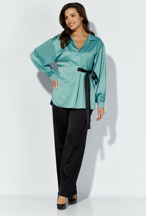 Комплект женский, 2-х предметный, состоящий из блузы и брюк.Блуза прямого силуэта с длинным рукавом. Рукав со спущенной линией плеча, по низу присобран на манжету. Манжета с застежкой на петлю и пуговицу, с возможностью регулировки по ширине. Горловина оформлена воротником, с отделочной пуговицей и мягкой складкой по центру переда. По спинке кокетка и мягкие складки. По бокам закругленные разрезы. Талия подчеркнута поясом из отделочной тесьмы. Пояс зафиксирован в боковом шве и складке переда. Брюки прямые, с наклонными карманами спереди. Пояс притачной с резинкой по кругу.