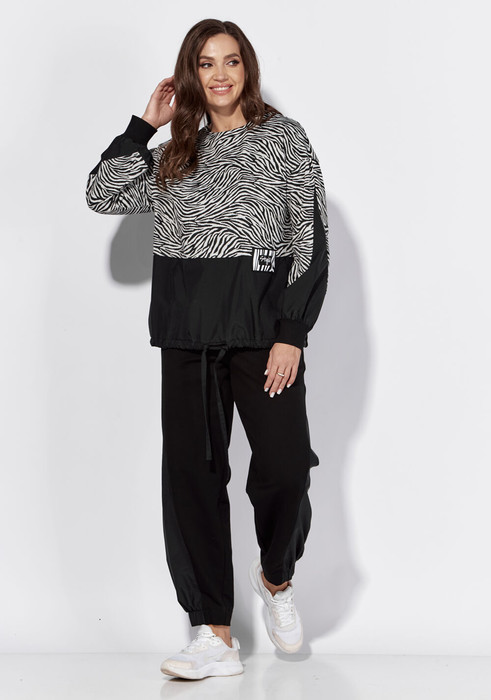 Комплект женский, 2х предметный, состоящий из джемпера и брюк. Комплект выполнен из двух видов трикотажного полотна и отделойной текстильной ткани. Джемпер прямого силуэта с длинным рукавом. Рукав со спущенной линией плеча, снизу на манжете. По переду и спинке горизонтальный подрез, со сменой ткани и отделочной нашивкой спереди. По рукаву вставка треугольной формы из отделочной ткани. Горловина круглой формы с подрезной бейкой. Низ присобран на регулируемую кулису. Брюки прямые, свободные, по низу на манжете, частично с резинкой. По бокам вставки треугольной формы из отделочной ткани. Спереди функциональные карманы. Пояс притачной, с резинкой сзади и частично по переду.