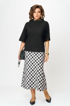 Комплект женский, 2х предметный, состоящий из блузки и юбки. Блузка полуприлегающего силуэта с цельнокройным рукавом длинной 3/4. Выполнена из трикотажного полотна "ТЕНСЕЛ". Вырез горловины "лодочка" По низу блузки, слева, декоративный элемент из рюши, в сочетании двух видов ткани. По спинке средний шов. Юбка широкая к низу, из текстильной ткани "вуалька" На подкладке. Пояс притачной с резинкой по кругу.