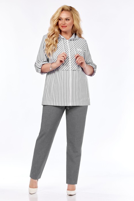 Стильный комплект-двойка, состоящий из жакета-ветровки в полоску и однотонных брюк, станет находкой для ценительниц комфорта и практичности. Жакет прямого силуэта с центральной застёжкой на молнию. Модель имеет притачной капюшон с регулировкой объёма. На переде обработаны нагрудные вытачки, горизонтальные подрезы, карманы с листочками. Спинка со средним швом. Рукав втачной, одношовный, с застёгивающейся патой, длиной 3/4. Низ спинки длиннее по отношению к переду на 5 см.