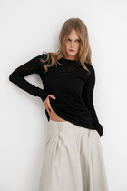 В боковых швах обработаны разрезы. Рукав втачной, короткий, присобран патой. Воротник стояче-отложной с отрезной стойкой.