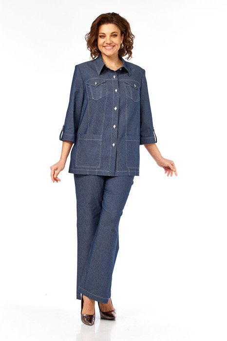Стильный комплект-двойка из хлопкового облегчённого джинса с эластаном. Свободный крой рубашки и брюк обеспечивает максимальный комфорт. Подходит для создания повседневных образов в сочетании с любой обувью и аксессуарами. Рубашка с центральной бортовой застёжкой на 6 петель и пуговиц. На полочках обработаны кокетки, рельефные швы, карманы. Спинка с кокеткой, рельефными швами. В боковых швах обработаны разрезы. Рукав втачной, одношовный, с цельнокроеной манжетой и застёгивающейся патой. Воротник стояче-отложной со стойкой. Брюки прямые, на притачном поясе с пуговицей, шлёвками и резинками в районе боковых швов. На передних половинках обработаны функциональные карманы. На задних половинках — кокетки, накладные карманы.