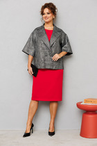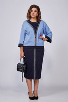 Комплект из двух предметов: блуза и брюки. Блуза женская жакетного типа, полуприлегающего силуэта, выполнена из струящейся поливискозы. Блуза с центральной застёжкой на петли и пуговицы. Горловина оформлена воротником пиджачного типа. Правая деталь переда блузы с нагрудной выточкой, левая - с вертикальным рельефом и подрезом, в области груди обработана декоративная листочка. Спинка цельнокроенная с талиевыми выточками. Рукав втачной длинный, низ рукава обработан притачной манжетой, которая застёгивается на 2 петли и пуговицы. Брюки классической формы, прямого силуэта, со стрелками по передним и задним половинкам. Верхний срез обработан обтачным поясом, дополнен практичными шлевками для ремня. На задних половинках расположены талиевые вытачки с настрочными декоративными листочками. В боковых швах брюк обработаны наклонные карманы. Застёжка центральная на тесьму-молнию и крючок. Брюки комплектуются ремнем.