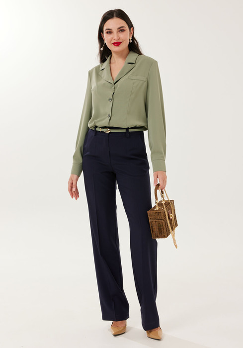 Комплект из двух предметов: блуза и брюки. Блуза женская жакетного типа, полуприлегающего силуэта, выполнена из струящейся поливискозы. Блуза с центральной застёжкой на петли и пуговицы. Горловина оформлена воротником пиджачного типа. Правая деталь переда блузы с нагрудной выточкой, левая - с вертикальным рельефом и подрезом, в области груди обработана декоративная листочка. Спинка цельнокроенная с талиевыми выточками. Рукав втачной длинный, низ рукава обработан притачной манжетой, которая застёгивается на 2 петли и пуговицы. Брюки классической формы, прямого силуэта, со стрелками по передним и задним половинкам. Верхний срез обработан обтачным поясом, дополнен практичными шлевками для ремня. На задних половинках расположены талиевые вытачки с настрочными декоративными листочками. В боковых швах брюк обработаны наклонные карманы. Застёжка центральная на тесьму-молнию и крючок. Брюки комплектуются ремнем.