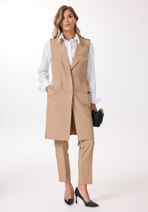 Костюм состоит из удлиненного жилета и брюк. Жилет без подкладки прямого силуэта с центральной бортовой застежкой на две петли-пуговицы, длиной ниже колена. Спинка с талиевыми вытачками, поясом и шлицей. Брюки классической формы, слегка заужены к низу, со стрелками по передним и задним половинкам. Верхний срез обработан притачным поясом, по спинке вставлена резинка для регулировки обхвата талии. По центру переда - застёжка на крючок и тесьму-молнию.
