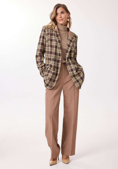 Костюм женский 3-х предметный, состоящий из жакета, брюк и джемпера. Жакет выполнен из поливискозы с принтом "клетка". Жакет полуприлегающего силуэта, на подкладке, с двухбортной застежкой на петли и пуговицы. Горловина жакета оформлена воротником пиджачного типа. Воротник выполнен из отделочной ткани-компаньена. Рукава двухшовные длинные с возможностью подворота длины. Перед с нагрудными выточками, выходящими из рельефов. В области бедер обработаны прорезные карманы "в рамку" с клапаном. Спинка со средним швом и рельефами. Брюки прямого силуэта со стрелками по передним и задним половинкам. Выполнены из однотонной поливискозы. Верхний срез обработан притачным поясом. По центру переда - застёжка на крючок и тесьму-молнию. На задних половинках расположены талиевые вытачки и декоративные листочки. В боковых швах расположены наклонные карманы. Джемпер прямого силуэта, выполнен из 100% вискозы. Перед и спинка цельнокроенная. Рукав длинный. Горловина типа "водолазка". Длина изделия - середина бедра.