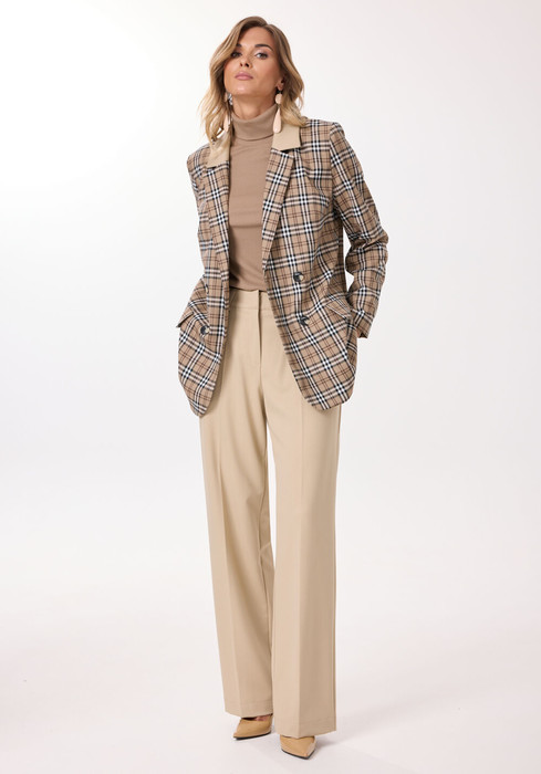 Костюм женский 3-х предметный, состоящий из жакета, брюк и джемпера. Жакет выполнен из поливискозы с принтом "клетка". Жакет полуприлегающего силуэта, на подкладке, с двухбортной застежкой на петли и пуговицы. Горловина жакета оформлена воротником пиджачного типа. Воротник выполнен из отделочной ткани-компаньена. Рукава двухшовные длинные с возможностью подворота длины. Перед с нагрудными выточками, выходящими из рельефов. В области бедер обработаны прорезные карманы "в рамку" с клапаном. Спинка со средним швом и рельефами. Брюки прямого силуэта со стрелками по передним и задним половинкам. Выполнены из однотонной поливискозы. Верхний срез обработан притачным поясом. По центру переда - застёжка на крючок и тесьму-молнию. На задних половинках расположены талиевые вытачки и декоративные листочки. В боковых швах расположены наклонные карманы. Джемпер прямого силуэта, выполнен из 100% вискозы. Перед и спинка цельнокроенная. Рукав длинный. Горловина типа "водолазка". Длина изделия - середина бедра.