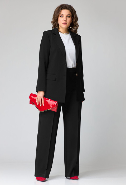 Элегантный костюм-тройка, состоящий из жакета, футболки и брюк. Жакет и брюки выполнены из костюмной ткани, футболка — из трикотажного полотна. Жакет прямого силуэта, с застежкой на две петли и две пуговицы. Перед жакета с нагрудной вытачкой, с прорезными карманами в рамку с клапаном. Спинка жакета со средним швом, заканчивающийся шлицей, левая часть спинки с прорезным карманом в рамку, вход в который фиксирует навесная петля с пуговицей. Рукава двухшовные втачные. Горловина оформлена воротником пиджачного типа. Белая футболка прямого силуэта со спущенной линией плеча и втачным рукавом. Горловина обработана трикотажной бейкой из основной ткани. Брюки классической формы, прямого силуэта, со стрелками по передним и задним половинкам. Верхний срез обработан обтачным поясом. На задних половинках расположены талиевые вытачки, с декоративными листочками. В боковых швах брюк - наклонные карманы. Застёжка центральная на тесьму молнию и крючок.
