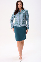 Комплект женский 2-х предметный, состоящий из блузы и брюк. Блуза выполнена из поливискозы с принтом "елочка". Блуза длиной до середины бедра, прямого силуэта, с центральной застёжкой на петли и пуговицы. Горловина рубашечного типа. Блуза со спущенной линией плеч. Рукава длинные, по низу обработана шлица и притачные манжеты, которые застёгиваются на 2 петли и пуговицы. На одной манжете настрочена декоративная нашивка. В области груди, с одной стороны, накладной карман с декоративной нашивкой. Спинка с кокеткой и со средним швом, в котором обработана шлица, застегивающаяся на 3 петли и пуговицы. Низ блузы закруглен. Брюки выполнены из полизивкозы однотонного компаньона. Брюки прямого силуэта, слегка заужены к низу. Низ брюк с цельнокроеной манжетой. Брюки с отстроченными по переду стрелками и заутюженными по задним половинкам. Верхний срез обработан притачным поясом, в который вставлена резинка. По центру переда - застёжка-обманка. В боковых швах расположены наклонные карманы.