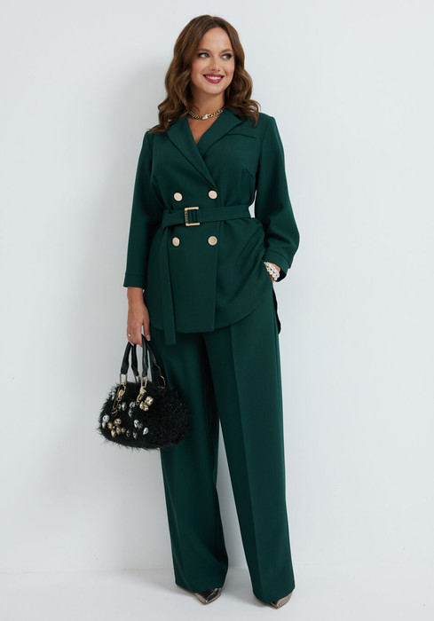 Костюм состоит из жакета и брюк. Качественная поливискоза, из которой выполнена модель, обеспечит долговечность изделию и приятные ощущения его обладательнице. Жакет без подкладки прямого силуэта, с двубортной застежкой на петли-пуговицы, длиной до середины бедра. Перед жакета с нагрудными вытачками, в области груди расположена декоративная листочка. Спинка с двойной кокеткой, в шве притачивания которой обработана встречная складка. Низ жакета фигурный, с закруглениями по боковым швам. Рукава двушовные, длиной 3/4, по низу с манжетой, застегивающейся на петлю и пуговицу. Горловина оформлена воротником пиджачного типа. Брюки классической формы, прямые от линии бедер, со стрелками по передним и задним половинкам. Верхний срез обработан поясом, в который от бокового шва вставлена резинка по задним половинкам. В боковых швах обработаны наклонные карманы. На задних половинках расположены талиевые вытачки. В комплект входит пояс из основной ткани.
