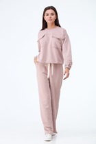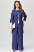Элегантный костюм-тройка, состоящий из жакета, джемпера и брюк. Жакет и брюки выполнены из костюмной ткани, джемпер — из трикотажного полотна. Жакет прямого силуэта, с застежкой на две петли и две пуговицы. Перед жакета с нагрудной вытачкой, с прорезными карманами в рамку с клапаном. Спинка жакета со средним швом, заканчивающийся шлицей, левая часть спинки с прорезным карманом в рамку, вход в который фиксирует навесная петля с пуговицей. Рукава двухшовные втачные. Горловина оформлена воротником пиджачного типа. Джемпер прямого силуэта, выполнен из вискозы. Перед и спинка цельнокроенная. Рукав длинный. Горловина типа "водолазка". Длина изделия - середина бедра. Брюки классической формы, прямого силуэта, со стрелками по передним и задним половинкам. Верхний срез обработан обтачным поясом. На задних половинках расположены талиевые вытачки, с декоративными листочками. В боковых швах брюк - наклонные карманы. Застёжка центральная на тесьму молнию и крючок.