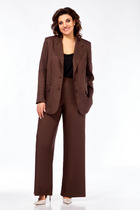 Юбка женская с небольшим расклешением к низу, на подкладке. Переднее полотнище в верхней части юбки с притачной кокеткой, талиевой вытачкой выходящей из кокетки и рельефными швами, выходящими из шва притачивания кокетки до низа. Немного ниже кокетки настрочены клапаны с прямыми углами, закрепленные пуговицей. Спинка юбки с талиевыми вытачками и средним швом, в котором обработана застежка на потайную тесьму-молнию. Средняя длина жакета по среднему шву - 49,0 см, Средняя длина рукава жакета - 61,0 см.