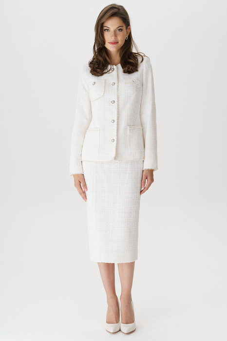 Костюм женский из костюмно-плательной ткани типа Chanel, состоит из жакет полуприлегающего силуэта на подкладке, и юбки-карандаш на подкладке. Костюм может использоваться и как для нарядной, так и для повседневной носки. Жакет женский с центральной бортовой застёжкой до верха на 5 петель и пуговиц (размер и цвет фурнитуры может незначительно отличаться от фото) и отделочной тесьмой с жемчугом, идущей по горловине, вдоль борта, карманам, низу изделия и низу рукавов. Перед жакета с рельефными швами, выходящими из проймы до низа и талиевыми вытачками. Правая полочка с двумя накладными карманами, нижний с прямыми углами и отделочной тесьмой вдоль входа в карман, верхний с закругленными углами и отделочной тесьмой вдоль шва настрачивания кармана, вход верхнего кармана застегивается на 1 петлю и пуговицу. Левая полочка с одним нижним накладным прямоугольным карманам с тесьмой вдоль входа в карман и верхней листочкой обманкой с тесьмой и 1 петлей и пуговицей. Спинка со средним швом и двумя вертикальными рельефными швами, выходящими из проймы до низа изделия. Рукава втачные, двухшовные, длинные. Горловина круглой формы, обтачная. Плечевой пояс оформлен плечевыми накладками.