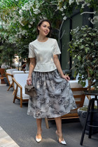 Костюм молодежный из тканого полотна в полоску, состоящий из блузы - рубашки и шорт. Блуза – укороченного силуэта, свободного покроя, с короткими цельнокроеными рукавами, обработанными манжетами, акцентными декоративными завязками спереди, отложным воротником и центральной бортовой застежкой на петли и пуговицы.Шорты - свободные, средней длины, с карманами в боковых швах, на притачном поясе с эластичной тесьмой внутри, с двойной подгибкой низа имитирующей манжет.