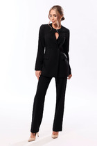 Комплект женский двухпредметный, состоящий из легкой блузы из вуаля и брюк. Блуза свободного кроя с центральной боковой застежкой на тесьму-молнию и двумя накладными карманами. Изделие со слегка спущенной линией плеча. Воротник - стойка. Рукав одношовный втачной длинный. Низ изделия по низу с притачной резинкой. Низ рукава с кулиской на петлю и фиксатор с тонкой резинкой. Брюки с притачным поясом сзади на резинке, классического кроя. Заужены к низу, с боковыми накладными карманами с притачным декором. Брюки с наклонным к боковому шву карманом. Застежка на тесьму-молнию и одну петлю-пуговицу по поясу.