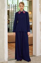 Жакет с центральной застежкой со спущенным фигурным краем на 4 петли-пуговицы и 2 декоративные. Перед с нагрудной вытачкой, выходящей из бокового шва и карманами с листочкой с втачными концами. Горловина V-образной формы. Спинка с центральным швом. По пройме спинки и переда обработан декоративный элемент, отстроченный отделочной строчкой. Рукав одношовный короткий.