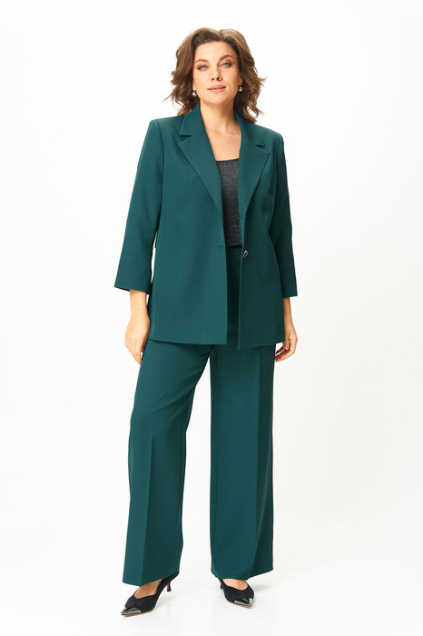 Костюм женский двухпредметный, состоящий из жакета и брюк. Жакет полуприлегающего силуэта, удлиненный, с центральной бортовой застежкой на 2 петли-пуговицы до линии перегиба лацкана. Перед с нагрудными вытачками, выходящими из горловины. Боковые швы с разрезами, между которыми по спинке вставлен пояс фигурной формы с декоратичной нашивкой. Спинка со средним швом. Воротник пиджачного типа. Рукава втачные двухшовные длиной 3/4. Брюки палаццо с притачным широким поясом на резинке от заутюженных стрелок по передней половинке вкруговую. Застежка на тесьму-молнию в средних срезах передних половинок брюк и 2 петли-пуговицы по поясу.