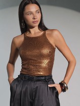 Костюм женский двухпредметный, состоящий из жакета и брюк. Жакет полуприлегающего силуэта, удлиненный, с центральной бортовой застежкой на 2 петли-пуговицы до линии перегиба лацкана. Перед с нагрудными вытачками, выходящими из горловины. Боковые швы с разрезами, между которыми по спинке вставлен пояс фигурной формы с декоратичной нашивкой. Спинка со средним швом. Воротник пиджачного типа. Рукава втачные двухшовные длиной 3/4. Брюки палаццо с притачным широким поясом на резинке от заутюженных стрелок по передней половинке вкруговую. Застежка на тесьму-молнию в средних срезах передних половинок брюк и 2 петли-пуговицы по поясу.