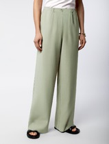 Брюки прямого кроя с заутюженными стрелками и с притачным поясом от середины передних половинок с резинкой вкруговую. Застежка на тесьму-молнию и 1 петлю-пуговицу по поясу.