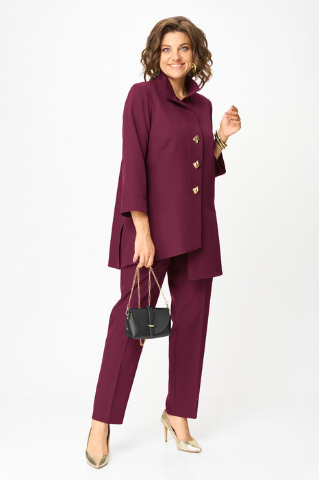 Комплект женский, состоящий из туники и брюк. Туника А-образного силуэта с центральной застежкой на планку до подреза на 3 декоративные петли-пуговицы. Перед с нагрудной вытачкой и фигурными подрезами. Спинка с горизонтальной кокеткой и двумя складками. В боковых швах обработаны разрезы. Низ переда ассиметричен и слегка разведен. Рукава втачные одношовные длиной 3/4 с защипом, имитирующим манжет. Воротник-стойка. Брюки классического кроя, зауженные к низу с притачным поясом сзади на резинке. Застежка на тесьму-молнию в среднем шве передних половинок и 1 петлю-пуговицу по поясу. На брюках заутюжены канты.