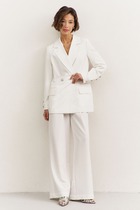 Костюм женский двухпредметный, состоящий из жакета на подкладке и брюк. Жакет со слегка спущенной линией проймы, свободного силуэта, с центральной бортовой застежкой на 5 петель-пуговиц от линии перегиба лацкана. Жакет с талиевыми вытачками от низа и до линии груди и планкой от талиевых вытачек вкруговую, переходящую на спинку. Жакет скомбинирован из двух цветов ткани: воротник, планка и отделочная деталь шлицы рукава выполнены из ткани в цвет брюк. Спинка со средним швом. Воротник пиджачного типа. Рукава втачные, двухшовные, с фантазийным элементомпо низу локтевого среза, имитирующим шлицу. По левой части переда обработан хлястик сс одной петлей-пуговицей, имитирующей карман. Брюки заужены к низу, с притачным поясом на 2 петли-пуговицы, с застежкой на тесьму-молнию в средних срезах передних половинок. Пояс сзади на резинке. По передним срезам канты отстрочены защипом на 0,2 см. В брюках обработаны карманы, наклонные к боковым швам.