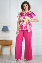 Костюм женский трёхпредметный, состоящий из жакета, брюк и блузы. Жакет полуприлегающего силуэта без подкладки с центральной бортовой застёжкой на 1 петлю-пуговицу. Перед с отрезным бочком, в котором обработаны нагрудные вытачки и боковой карман "в шве". Спинка со средним швом. Рукав одношовный втачной прямой длиной 3/4. Воротник пиджачного типа. По борту и мешковине кармана, низу изделия и рукава проложена отделочная строчка контрастного цвета. Брюки слегка зауженные к низу на притачном поясе, концы которого застёгиваются на обмётанную петлю и пуговицу, с застёжкой на тесьму-молнию спереди. Передние половинки брюк с боковыми карманами. По поясу задних половинок вставлена эластичная тесьма "резинка". Края пояса, низ изделия, гульфик и срез кармана отстрочены контрастной отделочной строчкой. Блузка женская из принтованной ткани полуприлегающего силуэта со слегка спущенной линией проймы. Горловина овальной формы. Длина жакета по спинке - 65,5 см. Длина рукава жакета - 46 см. Длина брюк по боковому шву - 99,5 см.