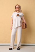 Брюки прямые, с центральной застёжкой на молнию и петлю-пуговицу.