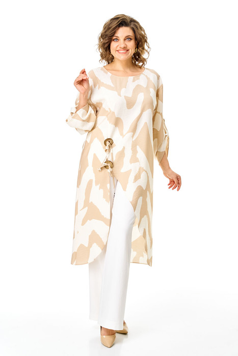 Туника удлиненная свободного кроя со спущенной линией плеча. Перед ассиметричный с рельефом выходящим из плеча и высоким разрезом. Рукав длинный с патой для фиксации низа рукава в подвернутом виде. Перед и паты рукавов украшены пуговицами разного диаметра из натурального кокоса. горловина округлой формы обработана внутренней бейкой.