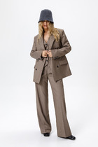 Костюм женский состоит из жакета и юбки. Жакет полуприлегающего силуэта с естественной линией плеча. Спинка со средним швом и рельефами из плеча. Перед с рельефами из плеча, с накладными карманами. Застежка центрально-бортовая на петлю-пуговицу. Воротник отложной пиджачного типа. Рукав втачной длинный. В локтевом шве рукава обработана отлетная шлица с отделочными пуговицами.