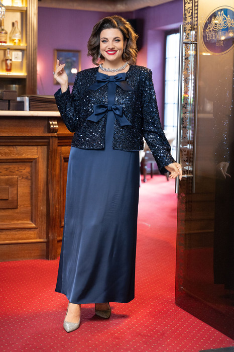 Комплект женский состоит из укороченного жакета из полотна с пайетками и атласного платья.