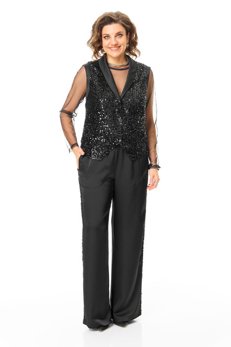 Брюки свободные расширенного силуэта. По бокам выполнены лампасы из полотна с пайетками. Пояс притачной на резинке. В боковых швах карманы.
