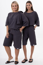 Данный костюм отлично подходит для торжественных мероприятий, свиданий, работы в офисе если дополнить его соответствующими аксессуарами и обувью Блузка свободного силуэта, с фигурной линией горловины по форме «лодочка»; по переду блузки нагрудные вытачки. По спинке блузки вырез капелька с застёжкой на пуговицу. Рукав втачной, длинный с фигурным вырезом, по низу рукава манжета с застёжкой на петли пуговицы. Брюки-кюлоты свободного силуэта, длиной 7/8 расширяются к низу. Пояс притачной со вставкой эластичной тесьмы-резинки, которая обеспечивает максимально удобную посадку на любой тип фигуры. По переду брюк от верха застрачиваются складки. В задней части брюк застёжка на тесьму-молнию в шве и пуговицу в поясе. В боковых швах брюк - карманы. Длина блузки от высшей точки плечевого шва до низа 60 см (р 50-54), 61 см (р 56-60). Длина рукава 61 см (р 50-54), 62 см (р 56-60). Длина брюк по боковому шву от шва притачивания пояса 93 см (р 50-54), 94 см (р 56-60).