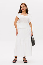Юбочный комплект женский двух – предметный, состоящий из блузки и юбки. Безумно элегантный и стильный комплект, который заставит обратить на себя внимание. Силуэт визуально вытягивает фигуру, позволяя скрыть недостатки и подчеркнуть особенности фигуры. Блузка (состав: 61% райен, 39% вискоза) «oversize» силуэта с расширенной горловиной округлой формы; горловина оформлена стойкой, линия плеча спущенная. По переду и спинке блузки идут декоративные подрезы. Рукав в блузке в стиле «кимоно» с конструктивным разрезом.Юбка (состав: 100% полиэстер, подкладка 100% полиэстер) прямого силуэта удлинённая, с притачным поясом, резинкой в бочках и застёжкой на молнию и пуговицу в поясе. В среднем шве юбки отлетная шлица. Юбка на подкладке. Длина по спинке 62 см (р 52-56), 64 см (р 58-62). Длина юбки 79 см (р 52-56), 81 см (58-62).