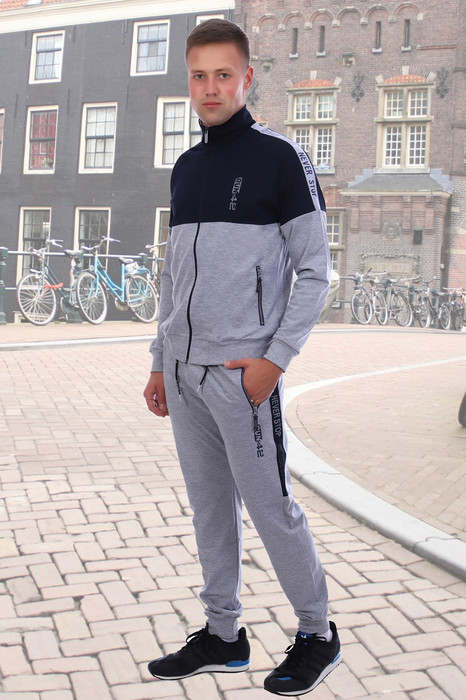 Костюм мужской из ткани высокого качества. Кофта на молнии, ворот-стойка, рукава-реглан. Рукава на манжете, сбоку по рукаву до локтя цветная вставка с печатью. Спереди на кофте два кармана на молнии. Слева на груди печать-надпись. Брюки на манжете. Спереди два кармана на молнии, один сзади без молнии. Сбоку на брюках до колена цветная вставка с печатью.